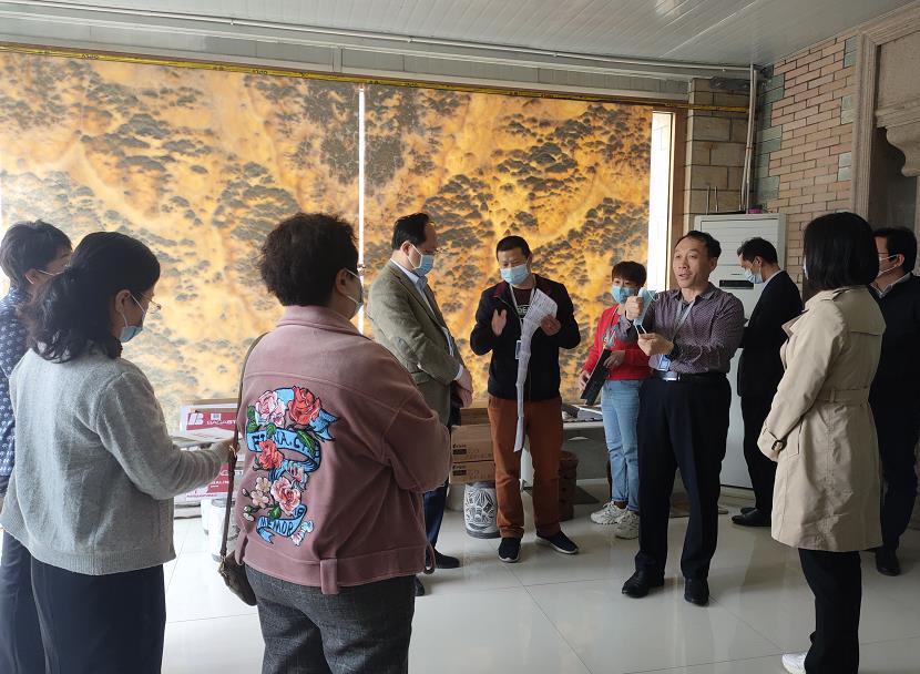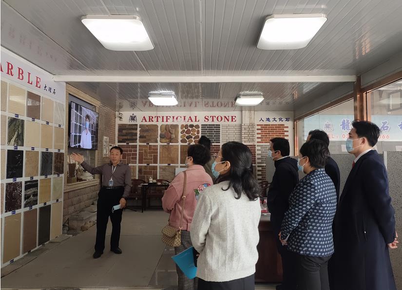 馮局長一行人參觀了展廳的文化石及工藝品等,同時耿經理匯報了企業的運行情況。各位領導對龍山石材的產品有了一定的了解并對龍山石材自主研發的美泉石加濕器給予了高度肯定,不僅具有觀賞性還具有超強的實用性。